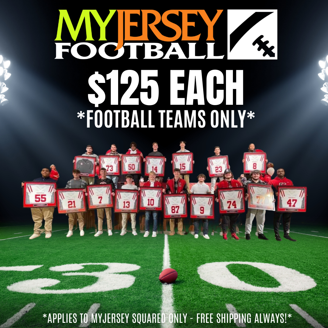 Honor your Seniors with a MyJersey Squared! The 24" x 24" MyJersey is personalized with the player's name, number, position and graduation year. Team Discount cost is $150 each (flat) with free shipping.